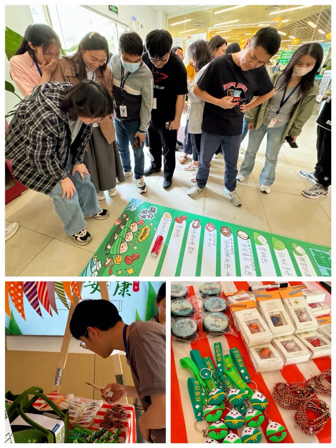 “端午滾滾樂”:食堂入口處,鋪上了一塊兩米長的地毯,裝點著可愛的小粽子,大小相同的空白窗格像階梯一樣列隊在地毯中央。員工們紛紛加入游戲,站在指定位置,將飲料罐滾動至相應窗格中,獲得驚喜獎品;未能獲獎的員工,也都領取到端午節(jié)五色繩。海陵工會為員工們準備了端午大禮包、補水儀、端午掛飾、零錢包等眾多獎品,活動現場熱鬧非凡,員工們積極參與游戲,共祝端午安康。