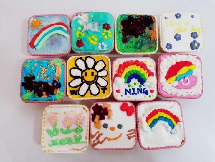23日上午,大家共同體驗(yàn)了盒子蛋糕和雪花酥的制作,打奶油、調(diào)顏色、畫蛋糕,過程中最興奮的當(dāng)屬孩子們了,他們用奶油畫上了各自喜歡的卡通圖案,和家長共同品嘗了自己的“甜蜜成果”。