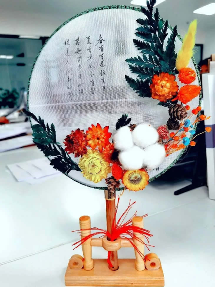 手中白團(tuán)扇。凈如秋團(tuán)月。永生花落座于團(tuán)扇,美在其形,美在其韻,希望“女神”們能與這幅團(tuán)扇一樣美在其心,美在其魂。